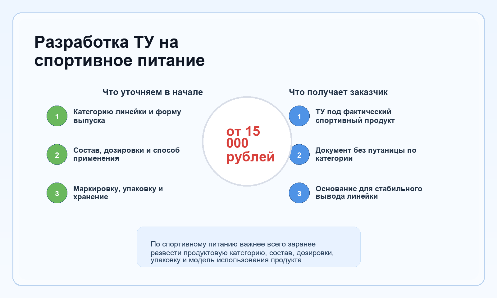 Здесь ТУ должны работать как точная техническая опора под конкретный продукт. Для этого документ собирается вокруг состава, дозировки, формы выпуска, упаковки и способа применения, а не вокруг абстрактного «спортивного питания» вообще.